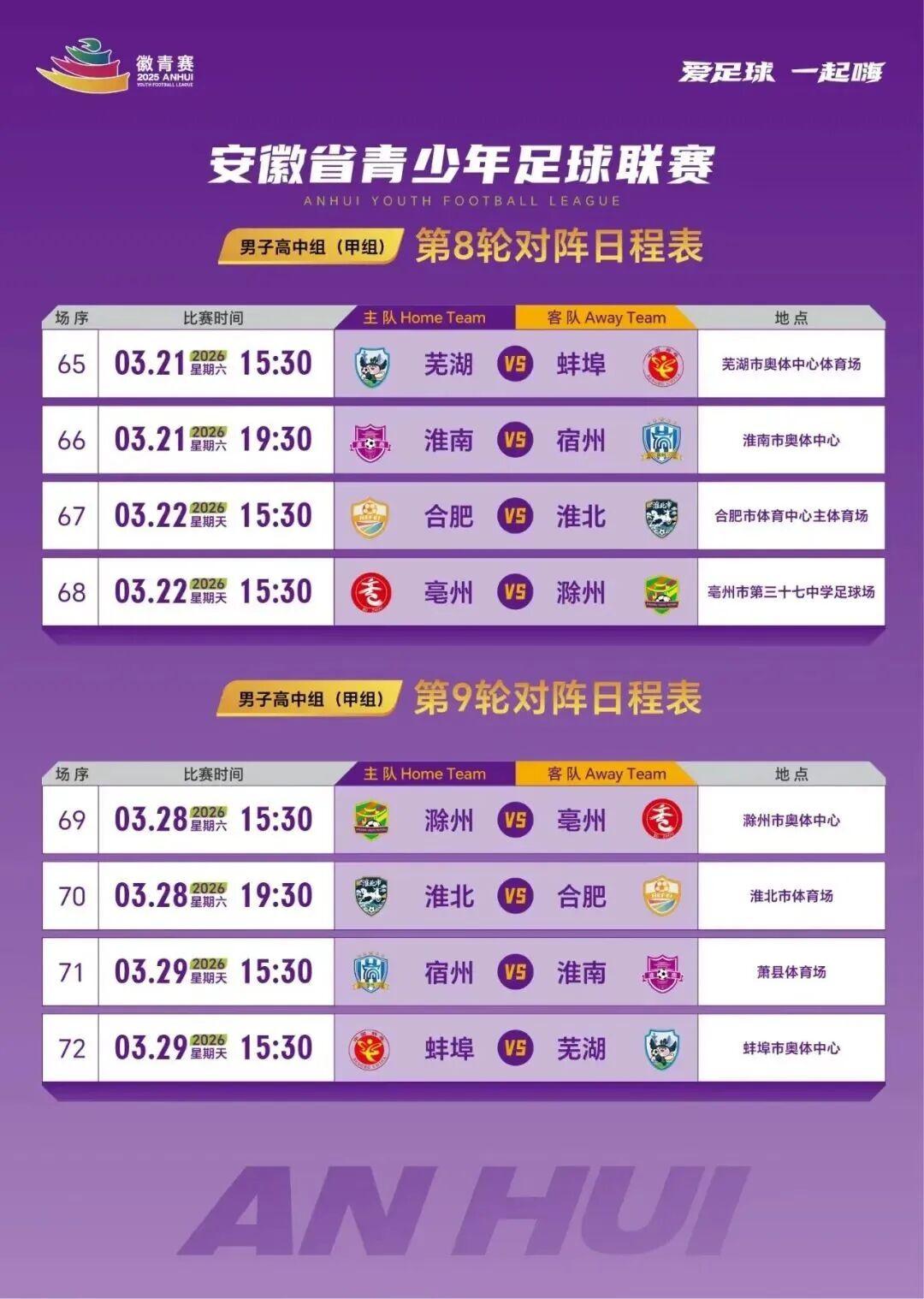安徽省青少年足球联赛(徽青赛)男子高中组比赛采取主客场制淮南队坐镇主场迎战宿州队对决即将拉开战幕绿茵场上必将精彩纷呈!所有的汗水,都为了这90分钟的绽放所有的战术,都为了这一刻的胜利请相信彼此,相信训练场上的每一次奔跑去战斗吧,去享受比赛,无论结果如何你们已是我们的骄傲!欢迎全市球迷来到主...